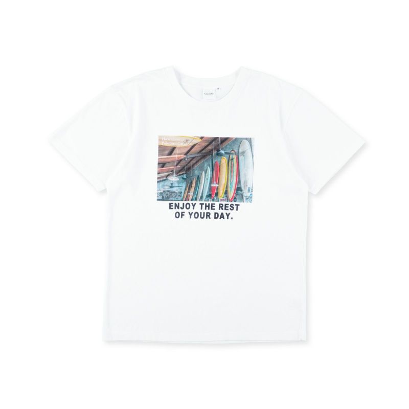 ハワイには欠かせないサーフボードのフォトをメインに、 フォトプリントの下には"良い一日を"という メッセージロゴが入ったTシャツです。